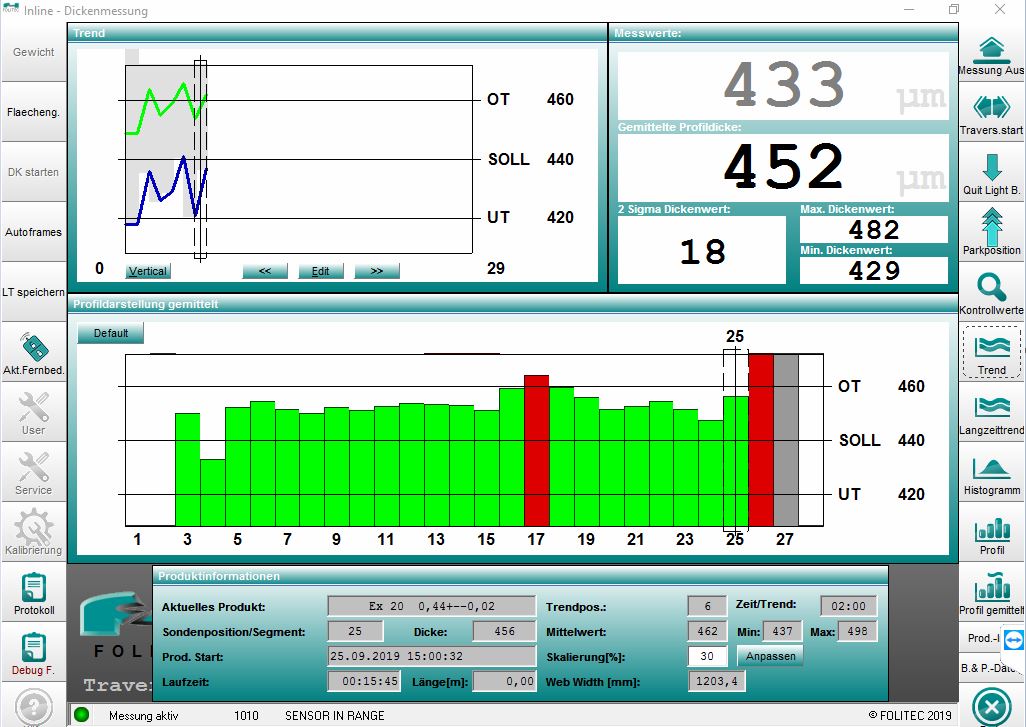 Thickness values in correlation to grammage. Industrial communication of many single values by Profinet Siemens S7 e.g. OPC-UA. Automatic edge scanning for the detection of the maximum film width, automatic length measurement of the webs.